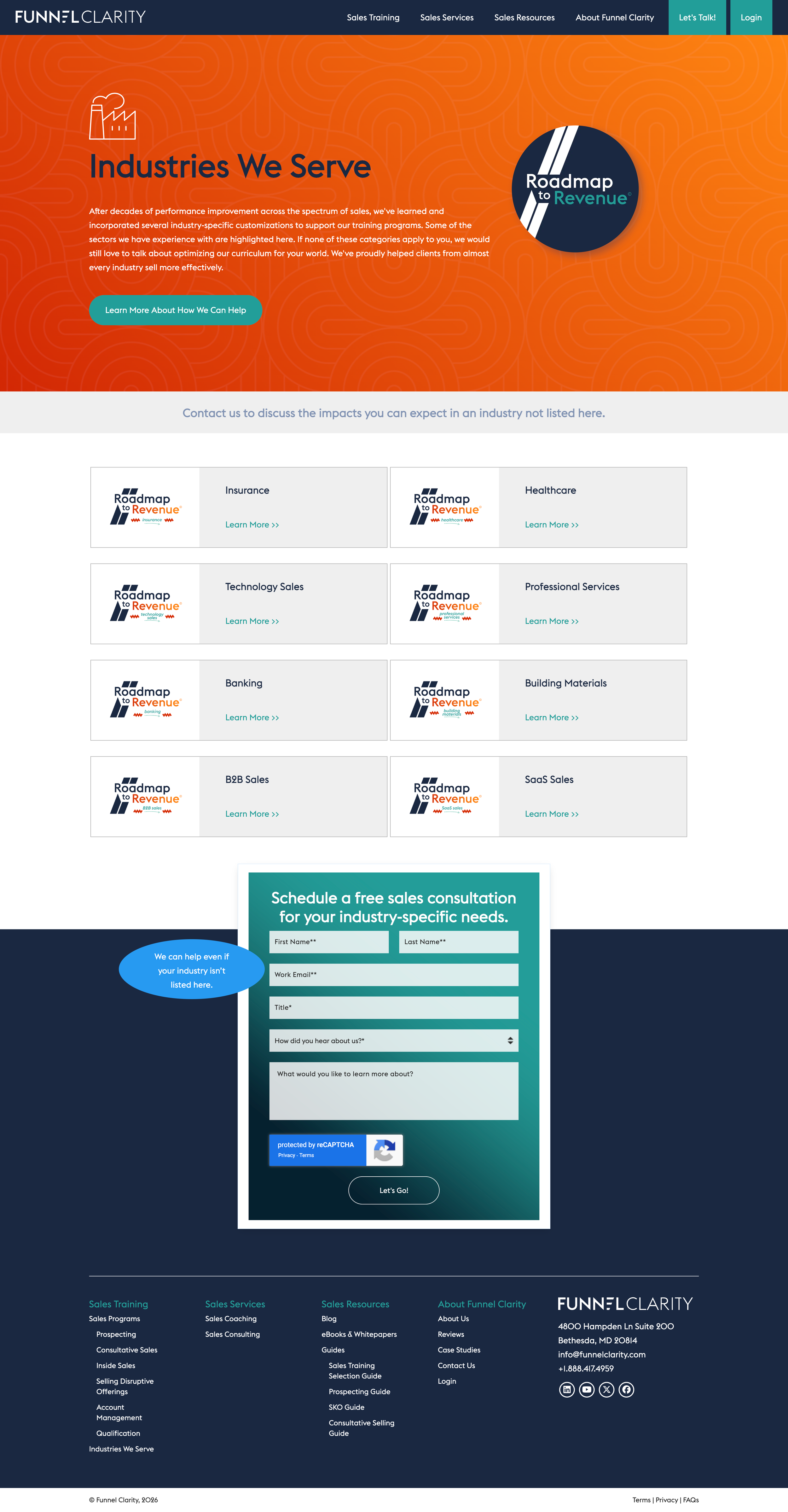 After assisting subject matter experts in formatting the content for the web, I designed and built a set of pages to showcase industry-specific benefits of the services offered by Funnel Clarity.